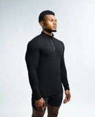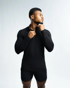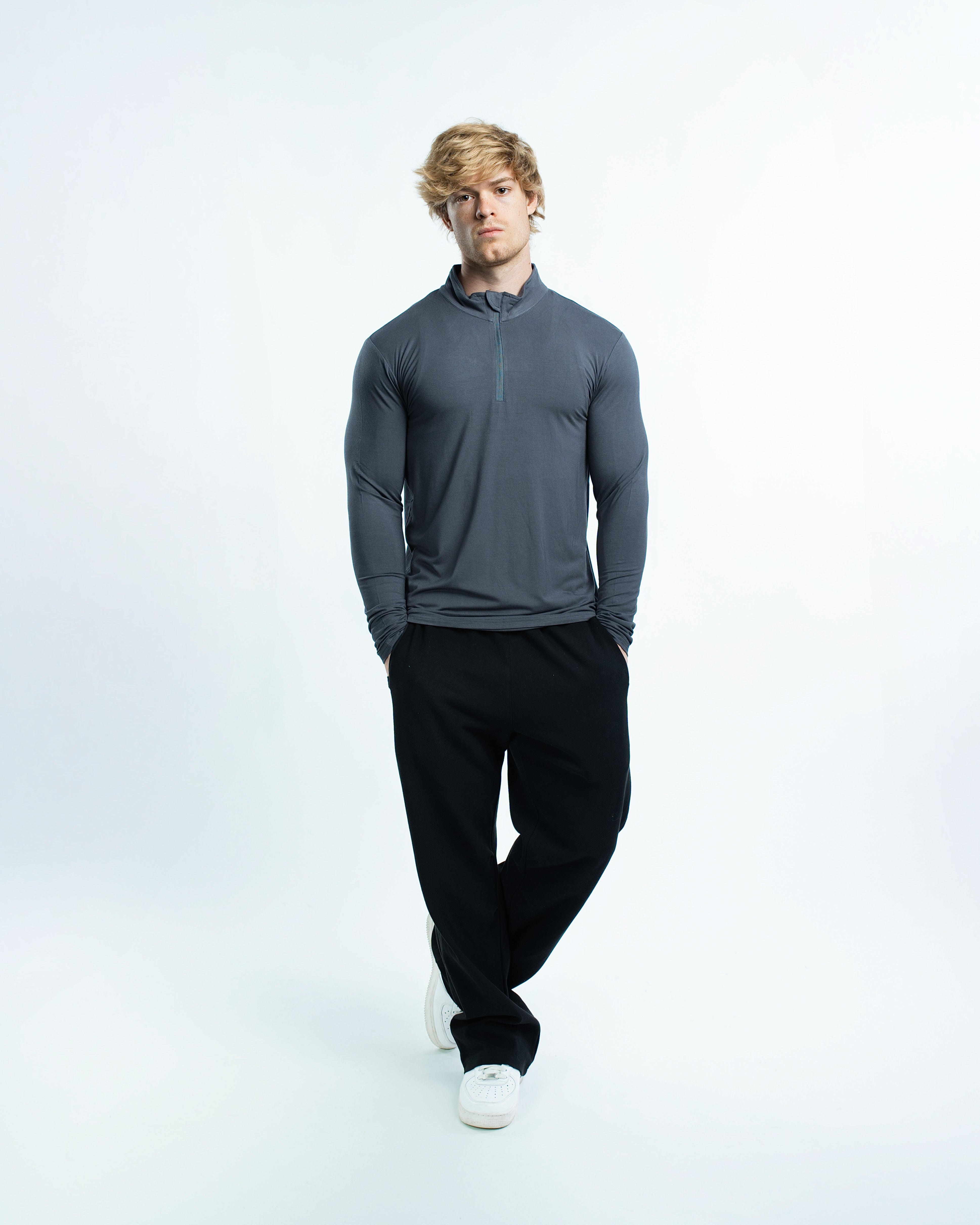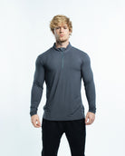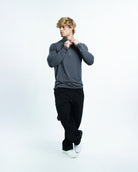 The EKKO Blank Quarter Zip is a simple yet versatile piece. It features a 1/4 zipper, offering a sleek and minimalistic look. This zip-up is perfect for those who prefer a straightforward style. The image showcases the product being worn by a model, providing a clear view of its fit and design.